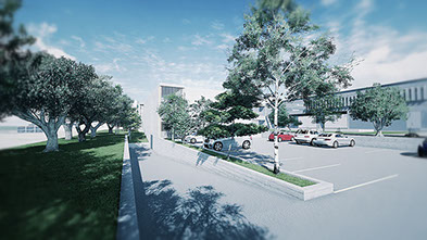 Las fachadas exteriores son de hormigón con textura rugosa y las interiores se construyen con sistema de muro cortina, que permite la iluminación natural de los espacios interiores.